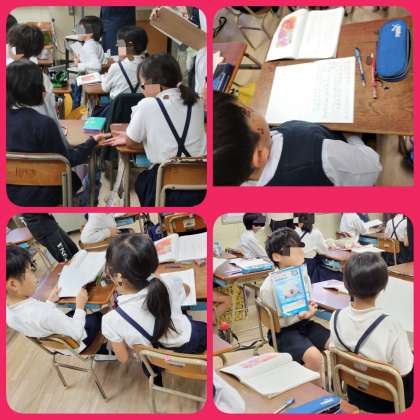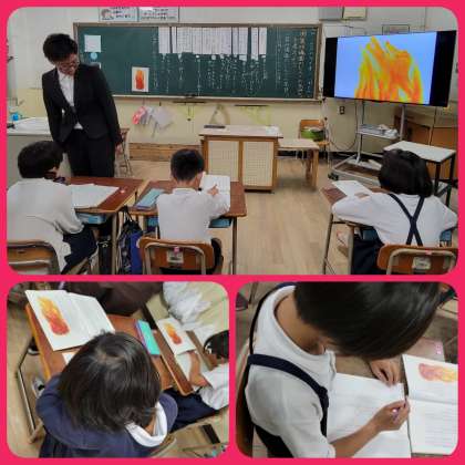 教材「サーカスのライオン」の学習をしています。今日は、第四場面から、じんざの様子や気持ちのわかる言葉を見つけ、金色に光るじんざの気持ちを想像し、自分の考えを書きました。