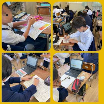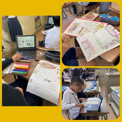 新聞づくりに取り組んでいます。タブレットや本で調べて書いています。