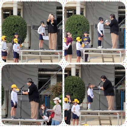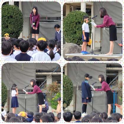 校長先生からは、気候の変わり目なので、体調を崩さないように気を付けましょうというお話がありました。その後、「夢の自転車絵画コンクール」に入賞した人への賞状を校長先生から、「親子でミッション」で1位から3位までの人や応募した人への賞状をPTAの方から、子ども達へ授与されました。
