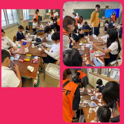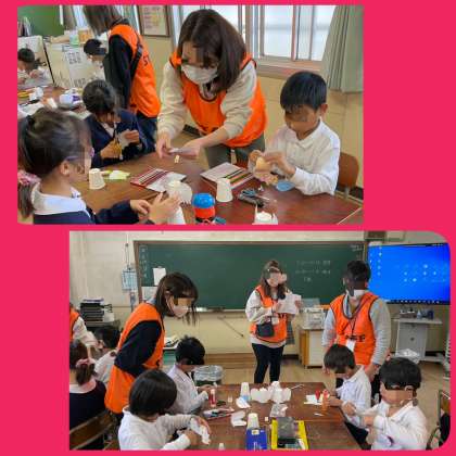 地域の方々をお招きして、紙コップを使って鳴くにわとりを作りました。