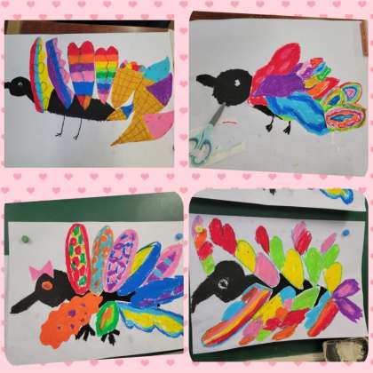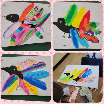 「おしゃれなカラス」にきれいな羽根が飾られてきました。背景に色をつければ仕上がりです。