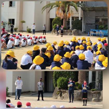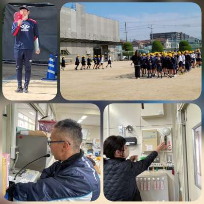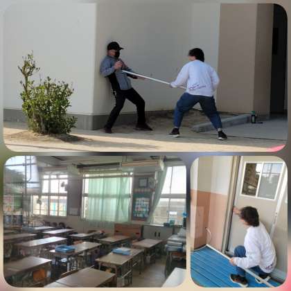 不審者が校内に侵入し、管理作業員室前から事務室を徘徊する。児童・教職員に危害を加えるおそれがあるので、平野警察に連絡し、出動を願うとともに、児童を安全な場所に避難させるという想定で行われました。