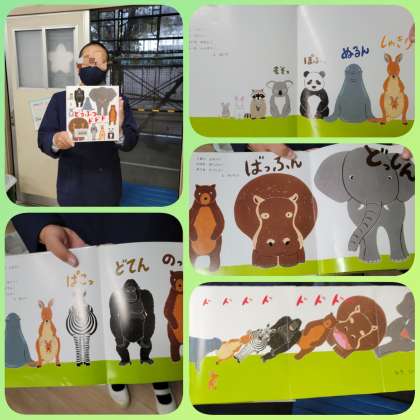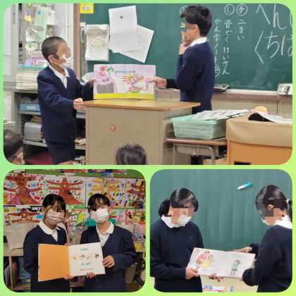 図書委員会の6年生が1年生に絵本の読みきかせをしている様子です。