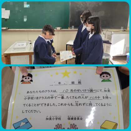 保健委員会の子ども達からは、「ハンカチ、ティシュ、つめ」などの清潔調べの結果の発表がありました。発表後、各クラスに賞状が届けられました。