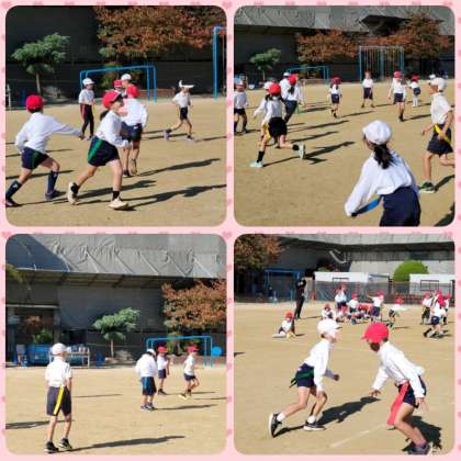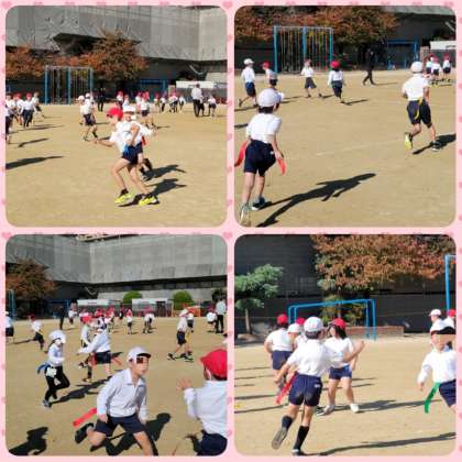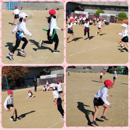 「タグ取りゲーム」をしました。タグを取ることができると「タグ!」と大きな声で言います。楽しそうにゲームをしていました。