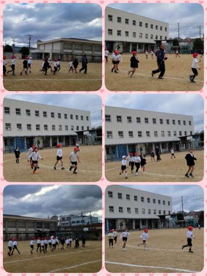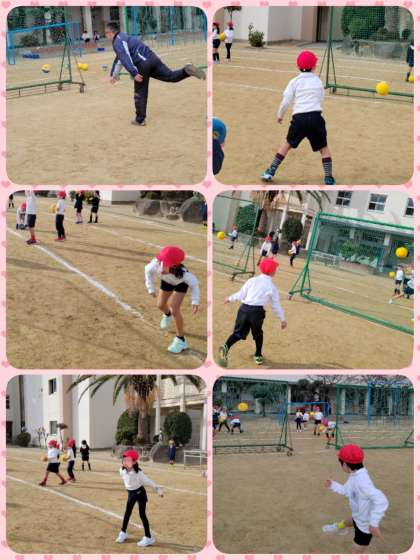 1年生の体育の授業の様子です。かけ足をした後、ボールの投げ方を学習しました。