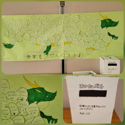 玄関には、加美小学校のみんなの今年がんばりたいことを書いたカードをはっています。