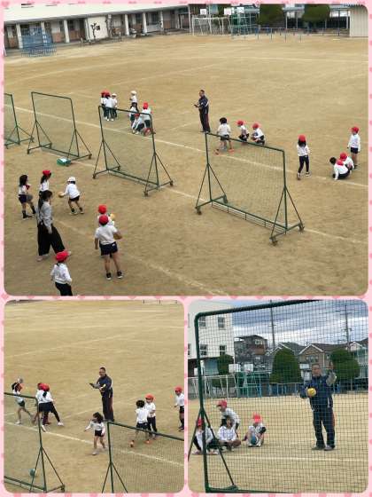 体育の授業の様子です。かけ足をした後、ボールを投げる練習をしていました。