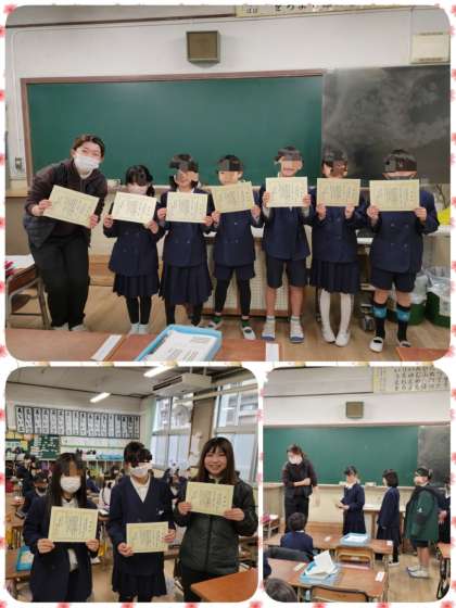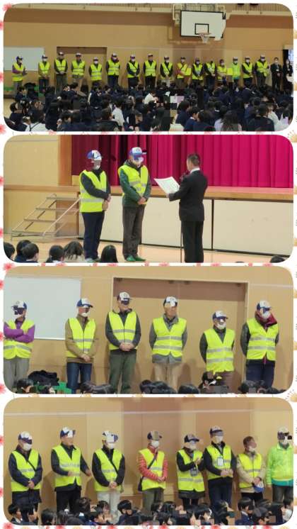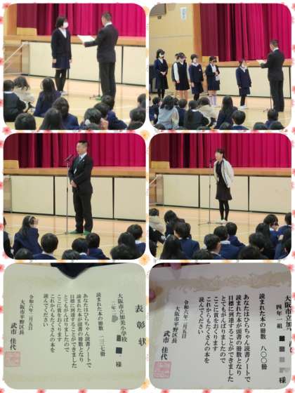 はじめに、見守り隊の皆様へ登下校の見守りについての感謝状が渡されました。次に、代表委員会の子どもに代表委員会の活動「あいさつ運動など」について賞状が渡されました。最後に、学年の代表の子ども達に、読書を頑張ったことに対して賞状が渡されました。今年は、「ひらちゃんノート」の目標を達成して、賞状をもらった子どもが、179人いました。朝会後、各学級で担任より賞状が渡されました。