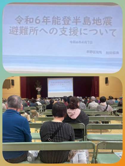 4月7日、防災の地域の取り組みで、「令和6年能登半島地震避難所への支援について」の話が加美小学校の講堂でありました。