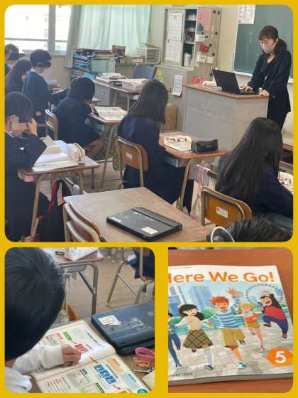 5年生の英語の授業の様子です。英語学習の進め方についてお話を聞いています。