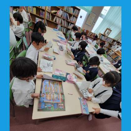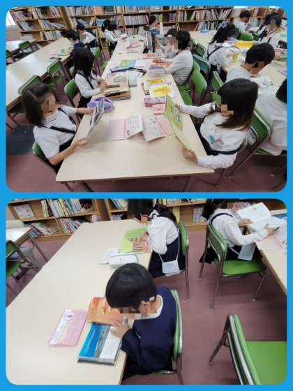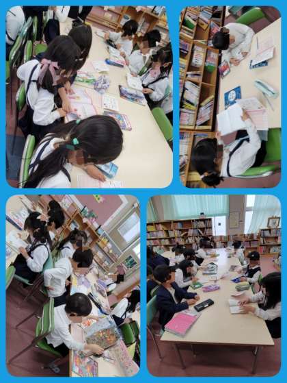 2年生になって、はじめての図書室です。読みたい本を借りて大喜びです。