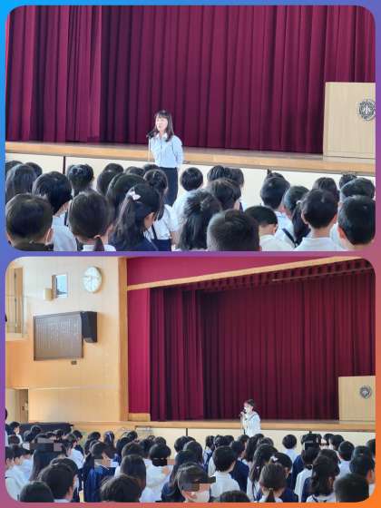 校長先生のお話は、6年生が遠足の電車で思いやりのある行動をしたこと、他の学年の子どもも同じように思いやりのある行動をしたことについてでした。