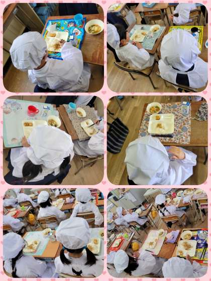 1年生の給食の時間の様子です。準備など、少しずつ早くなってきています。