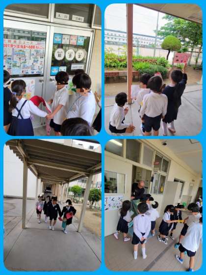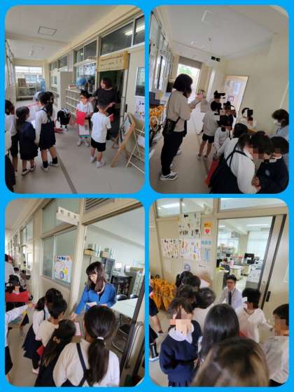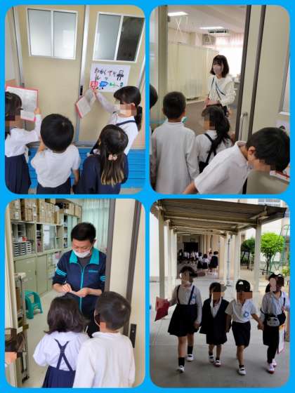 2年生が、各部屋の前で、何をする部屋かを1年生に説明しています。訪問した部屋でシールを貼ってもらいました。