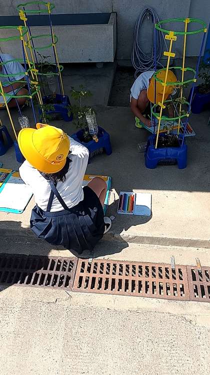 5月のぽかぽか陽気の中、2年生がミニトマトの観察をしています。