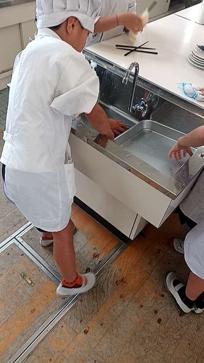 さて、準備や片付けも大事な学習。お皿を準備したり、トレイを洗ったり…みんなで協力です。
