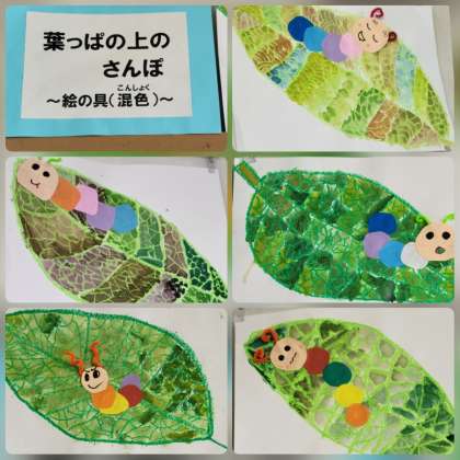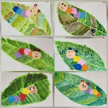 3年生の教室の後ろには、かわいい虫さんが葉っぱの上を散歩していました。