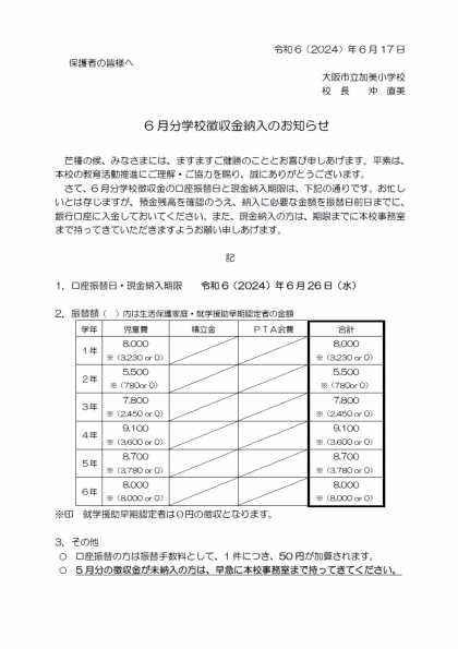👉6月分 学校徴収金納入のお知らせ