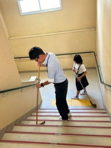 今日は教頭先生もみんなと一緒にお掃除です。