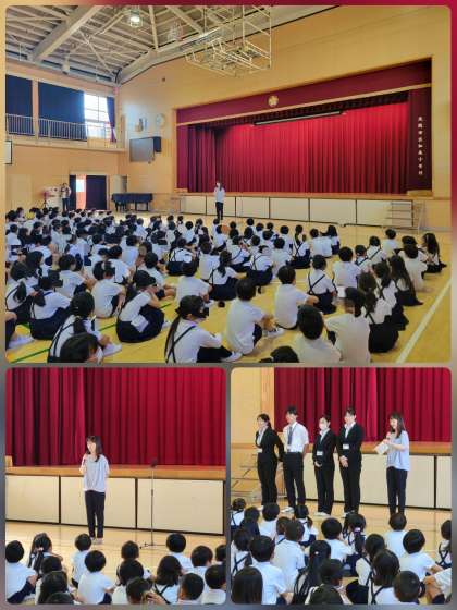 児童朝会がありました。校長先生から、台風などの防災についてのお話や、教育実習生の紹介がありました。