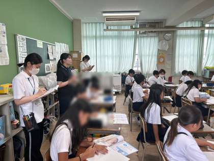 教育実習生の皆さんが、5年生理科の学習を見て勉強中です。