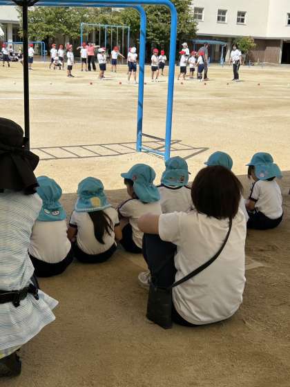 保育所・幼稚園の子どもたちが、1年生の運動会学習の見学にしています。