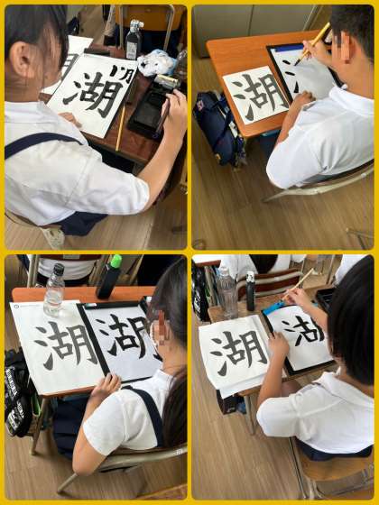「湖」という漢字を真剣に書いていました。