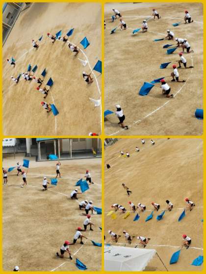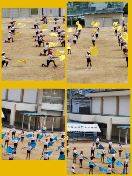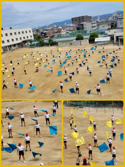 運動会に向けて、団体演技「フラッグ」の練習をしています。
