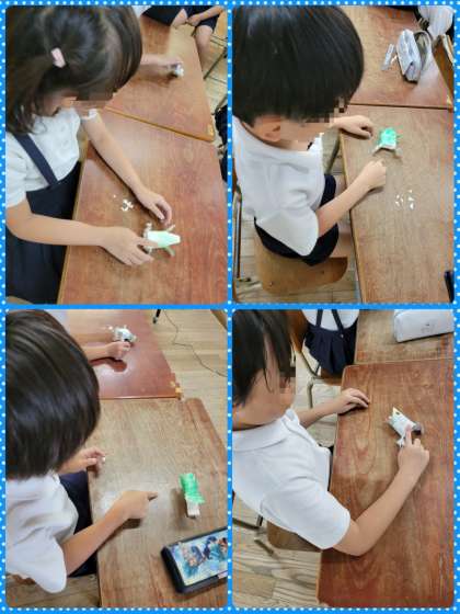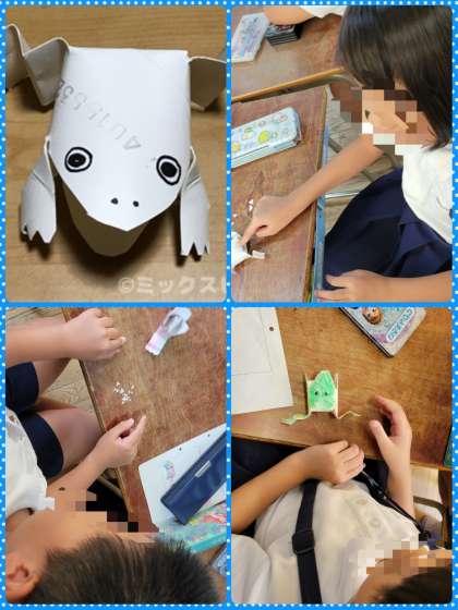 「ピョンピョンガエル」を作っていました。教室のあちらこちらで、カエルが跳んでいました。