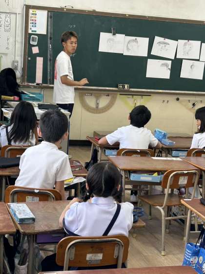 友だちにタブレットで「筒を覗く自分」を撮影してもらい、タブレットを観ながら自画像を描きます。