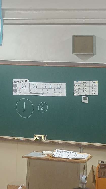 黒板にあるように、「タン(1拍)」「タ(1/2拍)」「ウン(1拍休み)」を低学年から覚えることはとっても大切!