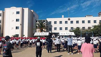 加美小学校の子どもたち、全員が運動場に集まり学習する姿は圧巻です。