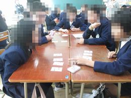 数学では、正の数負の数(プラスやマイナス)の学習をしました。トランプを使って、黒のカードは貯金(プラス)というふうに、ゲームをしながら正の数負の数の計算を学びました。