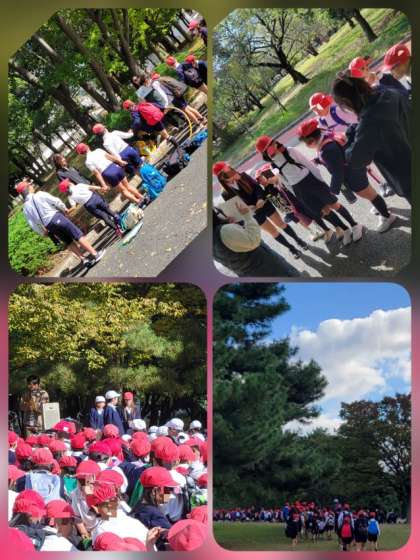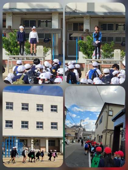 全校遠足に行きました。久宝寺緑地に向けて出発です。PTAの方も交差点で見守ってくださっていました。