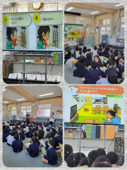 1年生と2年生が体験した「防災クイズ」の様子です。PTAの方々と一緒に、地震や火災が起こった時に、どのように身を守るとよいのかをクイズ形式で学習しました。