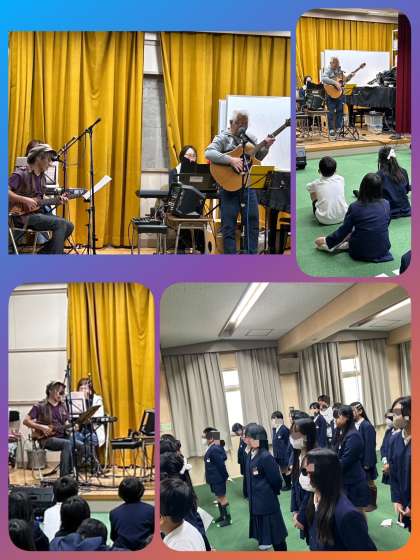 5年生が体験した「歌声教室」の様子です。地域のバンド「ドルフィン」さんをお招きして、生演奏に合わせて歌いました。