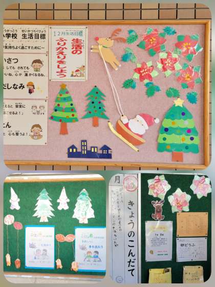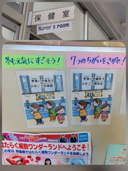 玄関と給食室前の掲示、保健室前の掲示の様子です。