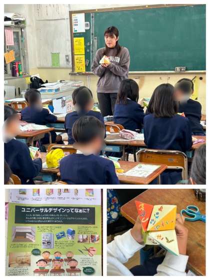 ユニバーサルデザインについて学習しています。身体障害者マークや耳マークなど、いろいろなマークについて学習しました。