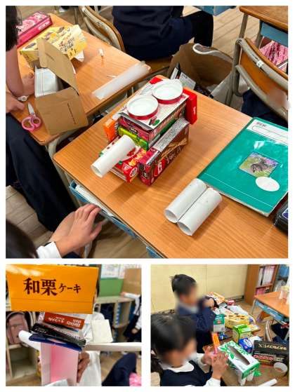 1年生の図工の学習の様子です。たくさんの箱で何かを作っています!