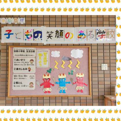2月の玄関掲示です。掲示板の上には、代表委員会作成の学校目標が掲示されています。
