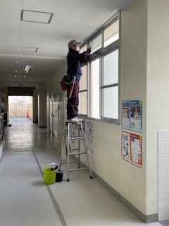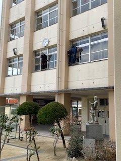卒業式が近づいてきましたので、毎年恒例の校舎窓清掃を行っていただきました。