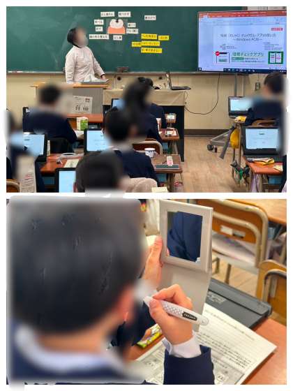 フッ化物と歯磨き指導の学習の様子です。正しい歯の磨き方について学習し、実践しています。