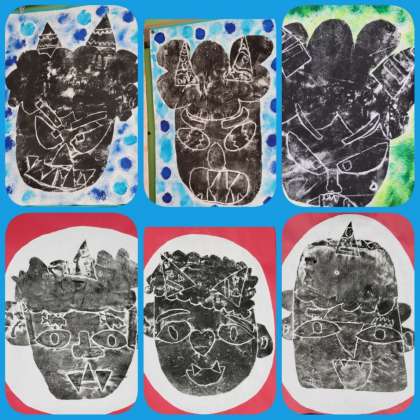 教室の後ろに「おに」の紙版画が掲示されていました。