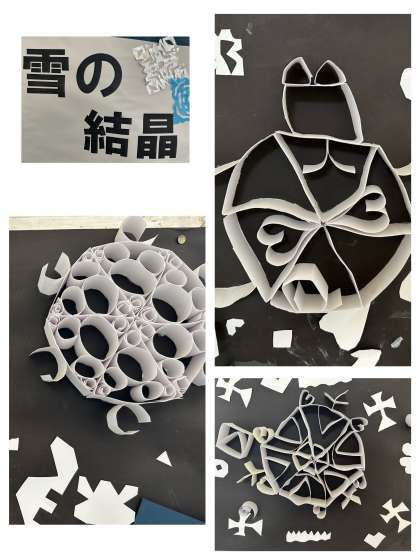 3年生の図工の学習で作った作品です。画用紙でいろいろな形を作り雪の結晶を表現しています。