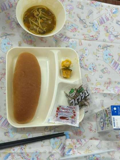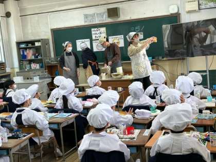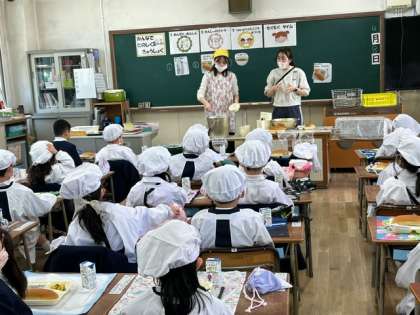 一年生の給食です。はじめてなのでルールをしっかり聞いて用意しています。