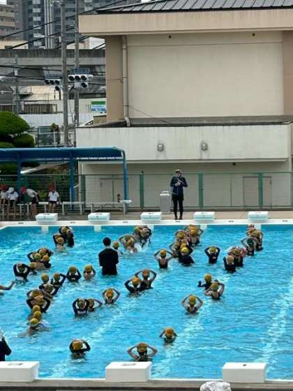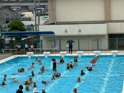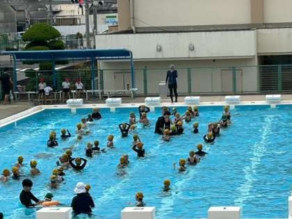頭のてっぺんまでしっかりつかって熱中症にならないように気をつけてプールに入っています。