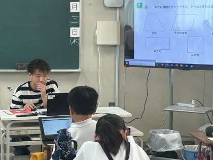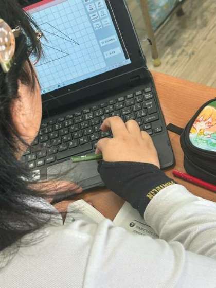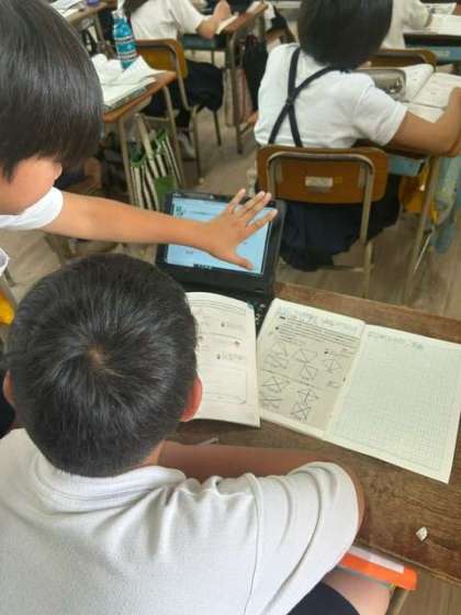 図形の学習です。友だちとも教え合いながらタブレットを使って学習を進めています。