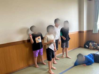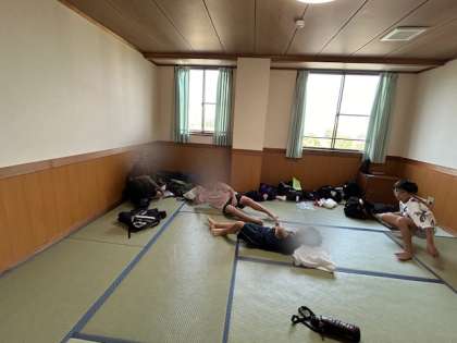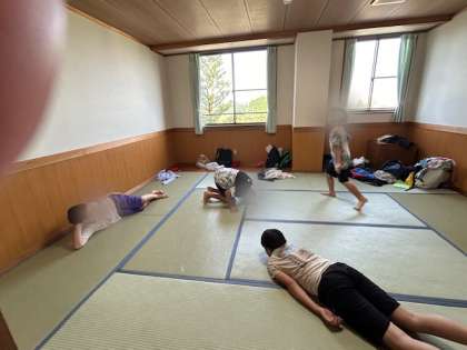 魚つかみと焼き板磨きを終えて宿に戻って来ました。暑くて汗ぐっしょりです。部屋でくつろぐ男の子たちです。