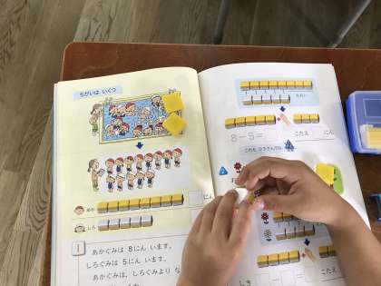 算数の「ひき算」の学習です。いくつ多いかなと算数セットのブロックを使って学習しました。発表するときに、手をまっすぐ挙げている姿がとてもかっこよかったです。